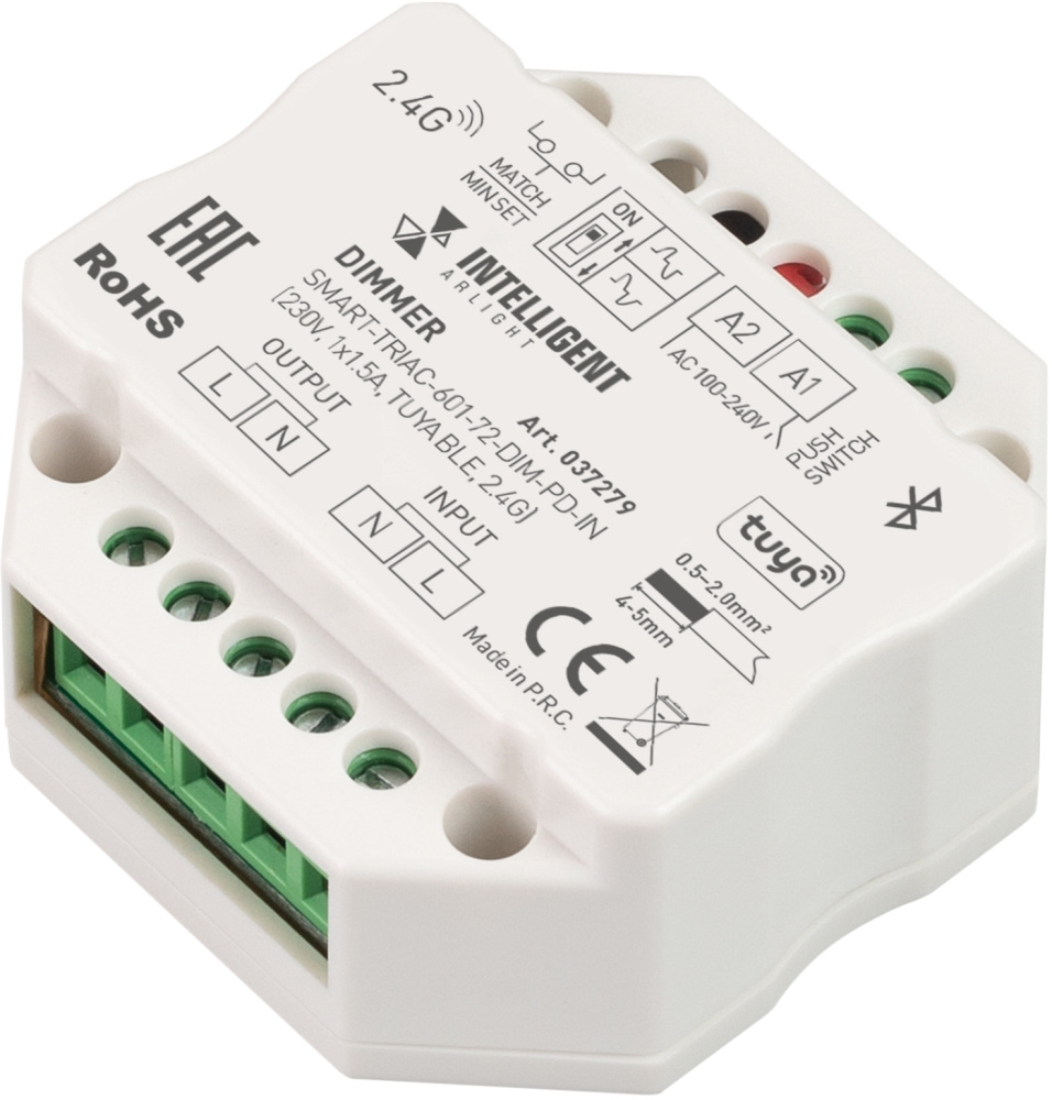 INTELLIGENT Диммер SMART-TRIAC-601-72-DIM-PD-IN (230V, 1x1.5A, TUYA BLE, 2.4G) (IARL, IP20 Пластик, 5 лет) 037279 Arlight 037279_ARL