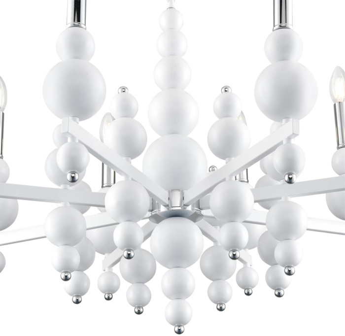Арматура люстры выполнена из металла и окрашена в белый и хром цвета. Высота светильника составляет 94 см, а ширина – 72 см, что позволяет использовать его в помещениях различного размера.