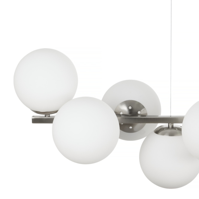 Арматура люстры выполнена из металла и стекла, а цвет арматуры – никель. Плафон из стекла белого цвета обеспечивает равномерное распределение света.