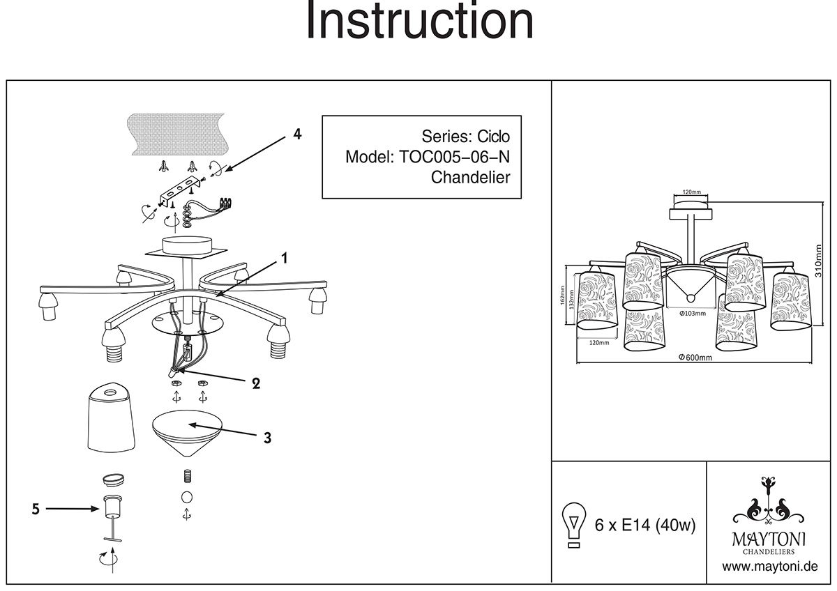 Производитель Maytoni применил в этой люстре лампы с цоколем E14 и максимальной мощностью 60 Ватт. Установив в светильнике современные светодиодные LED лампы, Вы получите оптимальную освещённость в помещении.