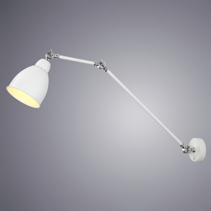 Светильник ArteLamp Braccio A2055AP-1WH оснащен лампами с цоколем E27 и максимальной мощностью 60 Ватт, что обеспечивает наилучшую освещенность в помещении. Выключатель расположен на корпусе, что делает управление светильником удобным и простым.