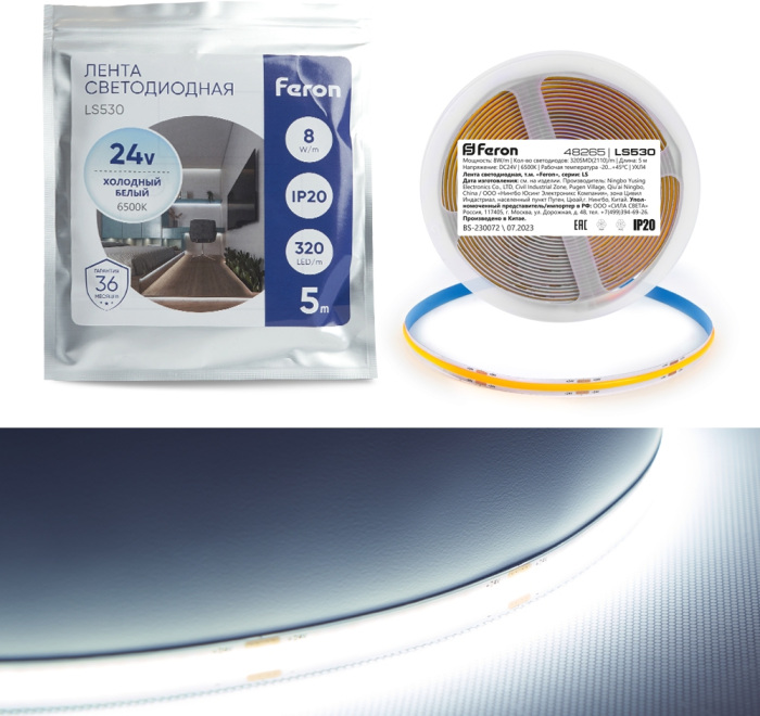 Светодиодная COB лента 512SMD(2110)/м 12Вт/м 24V 6500К Feron 48968_FR