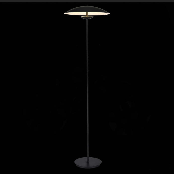 Арматура торшера выполнена из металла и окрашена в черный цвет. Плафон изготовлен из того же материала и имеет диаметр 45 см. Это придает светильнику современный и стильный вид.