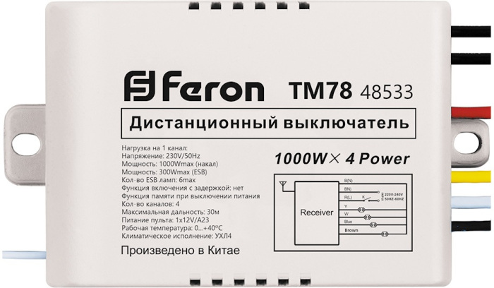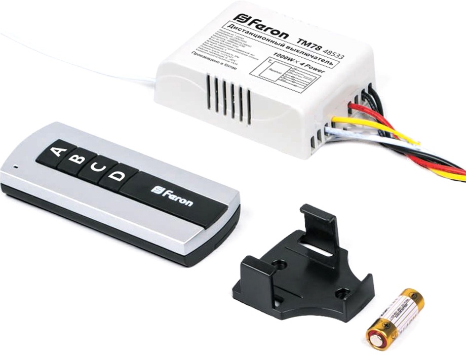 Выключатель дистанционный TM78 220V 48533 1000W 4-х канальный 30м с пультом управления, черный/серебро Feron 48533_FR